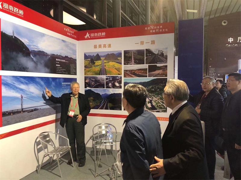 湖南路橋展臺通過現場豐富的視頻介紹,背景墻的圖片展示,精彩的文字說明,集中向參會人員展示了集團光輝的發展歷程,形象地介紹了集團的宏偉發展規劃以及最新成果,可以稱得上是會議的熱門展廳。展廳吸引了中國工程院院士王景全等眾多專家和領導駐足,王院士還興致勃勃地向原交通部部領導李盛霖、胡希捷等熱情介紹了矮寨大橋和洞庭湖大橋兩大公司精品工程。
