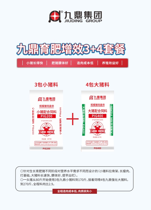 九鼎集團(tuán)專注豬料生產(chǎn)研發(fā)29年,致力于為廣大養(yǎng)殖企業(yè)提供優(yōu)質(zhì)高效的飼料產(chǎn)品,在全國(guó)擁有分子公司近30家,年銷(xiāo)售飼料200萬(wàn)噸,此次展會(huì)推出了全新的套餐系列: