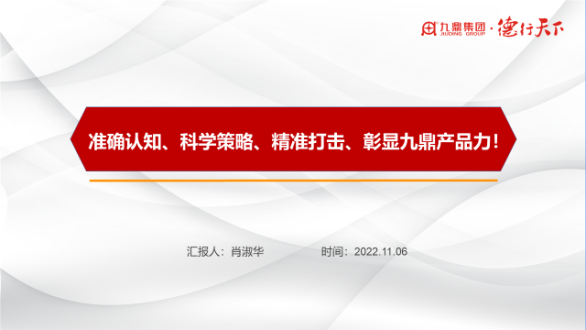 準(zhǔn)確認(rèn)知、科學(xué)策略、精準(zhǔn)打擊、彰顯九鼎產(chǎn)品力。2022年11月6日由人力行政中心組織九鼎產(chǎn)品力戰(zhàn)略宣貫會(huì)在集團(tuán)總部14樓會(huì)議室召開(kāi)。集團(tuán)副總裁肖淑華帶領(lǐng)九鼎人立足行業(yè)制高點(diǎn),以深入和敏銳的視角來(lái)剖析九鼎的產(chǎn)品。